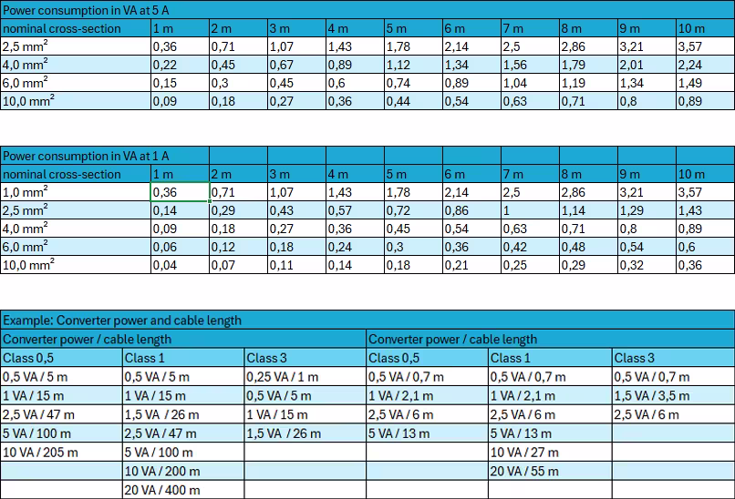 Quick overview (power consumption Cu cable) for 5 A and 1 A